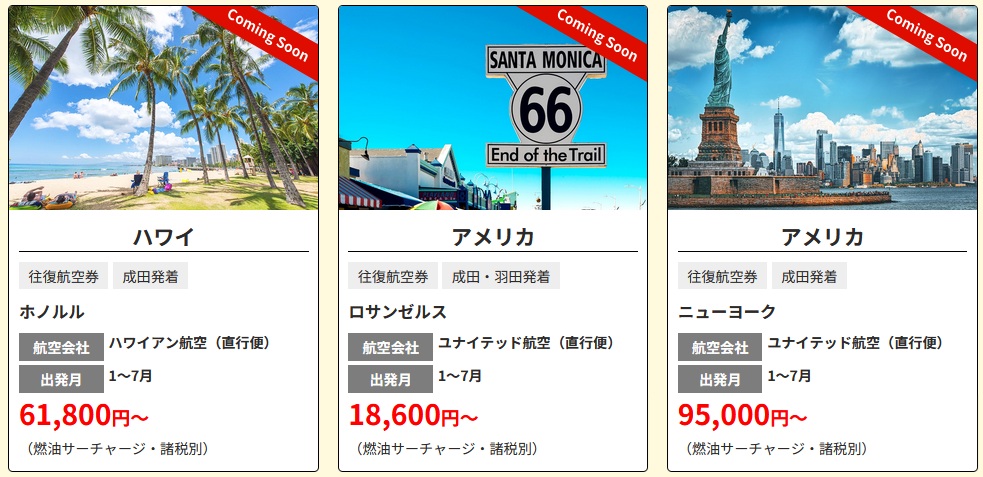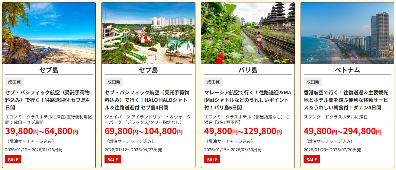 セールだけでなく特典や割引も用意されており、ツアー10,000円OFFクーポン、パスポート代5,000円補助などセール価格と合わせ使うことができる。詳しくはクーポン/特典まとめで。