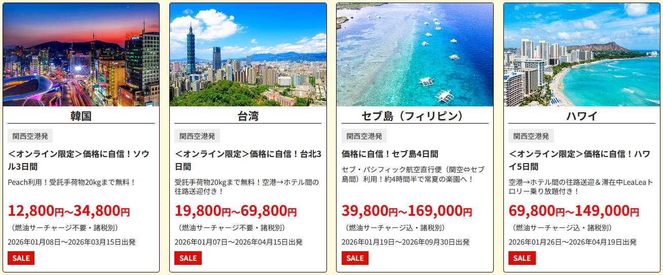 関西発は格安ツアーが多数登場し、ソウル3日間1.2万円、台北3日間1.9万円、ハワイ5日間6万円台などの、通常ではまずない安い価格で販売されるので、狙うならセール開始時間に。
