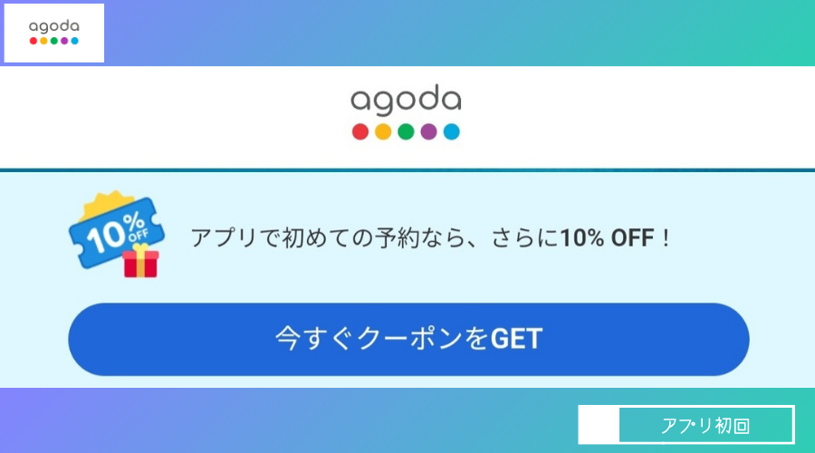 Agodaでは初めてのアプリ利用者向けに『10%OFFキャンペーン』を実施中!既にAgodaを利用したことがあっても、アプリからの予約がまだならこちらのキャンペーンが使える。スマホならトップページの上部に、PCなら右下に案内が掲載されている。