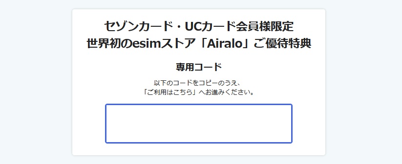 Airaloでは、セゾンカード・UCカード所有者向けに『20%OFFクーポン』を配布!カード番号を入力すると割引コードが表示されるので、それをコピーして決済画面で入力するだけ。