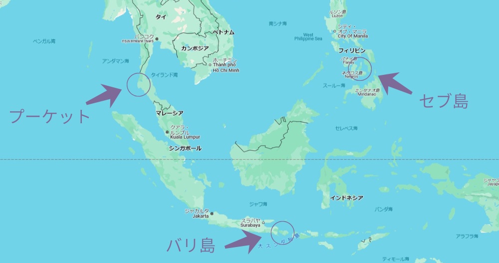 バリはインドネシア、セブはフィリピン、プーケットはタイにある。それぞれ特徴があり、バリは本格的なリゾート地、セブは学生に人気、プーケットはナイトライフが楽しめる。