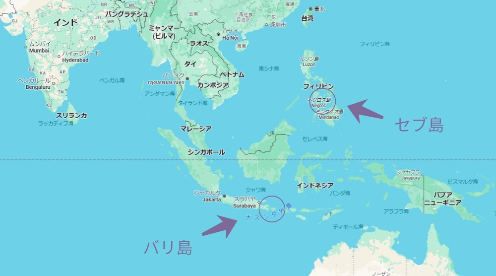 日本からの飛行時間はバリが約7時間、セブが約5時間となっており、アクセスに関してはセブが優位で、LCCの直行便もあり費用を抑えることができる。対するバリは、デンパサール行きが少なく、飛行時間もやや長いのが欠点。地図で見ても、すぐ南はオーストラリアという位置にある。
