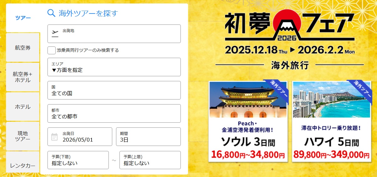 HISの初夢フェア2026で販売された「ソウル3日間・14,800円」。大型セールで登場する激安ツアーの典型であり、とにかく安さを重視したい人には向いているプランだった。このようなプランは、初夢フェアやスーパーサマーセールといった大型セールで出てくる可能性があるので、格安で行きたいならチェックしておくのが良いだろう。