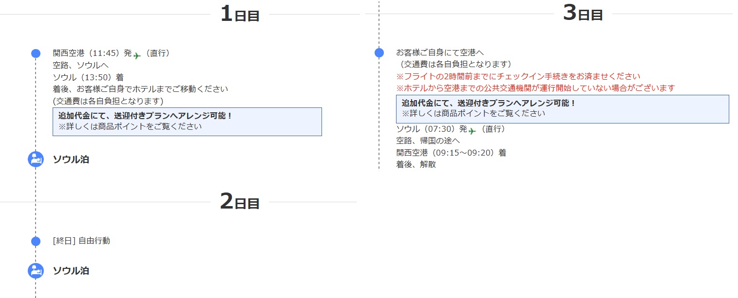 旅行期間は3日間となっているが、激安プランなので実質的には2日間で、まず関空を午前に出発し、午後にソウル到着。移動を除くと1日目の夕方と2日目が丸一日観光に使える。3日目は朝の7時に出発なので何もすることはできない。