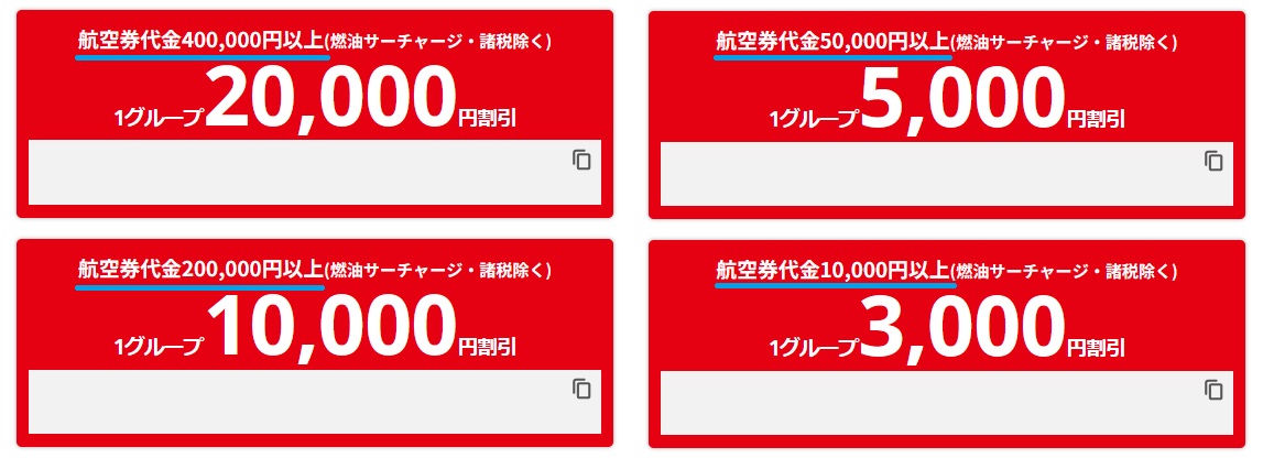 このクーポンは航空券代によって使える割引額が変わるのがポイントです。欧米や複数人の予約をまとめて行うとお得になります。