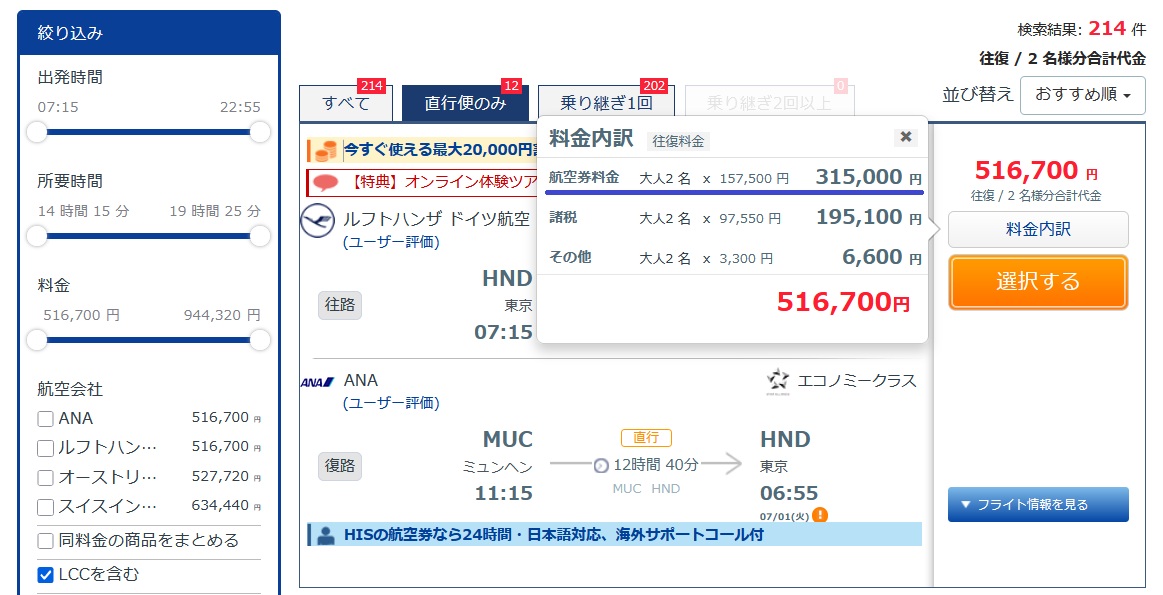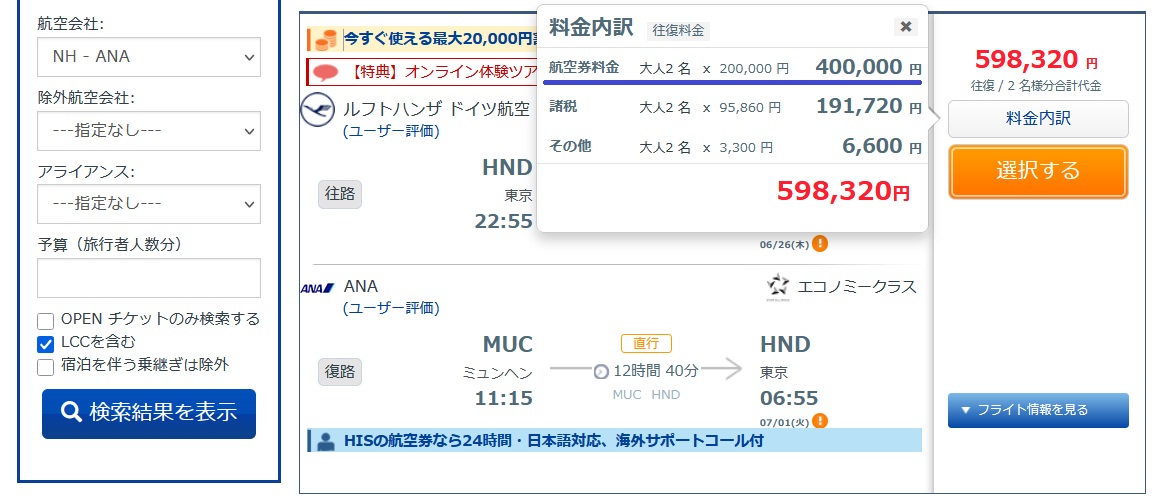 2人でヨーロッパ直行便あれば40万円を超える額になるが、ここで落とし穴がある。それが、先ほどの旅費の記載にあった「燃油サーチャージ・諸税除く」の文字。この航空券は51万円だが、純粋な航空券代は31万円なので、2万円割引は使えない。