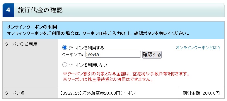 旅費40万円の条件を満たしているので2万円が使える。クーポンコードを取得して、決済画面の情報確認ページ④に入力すれば完了だ。