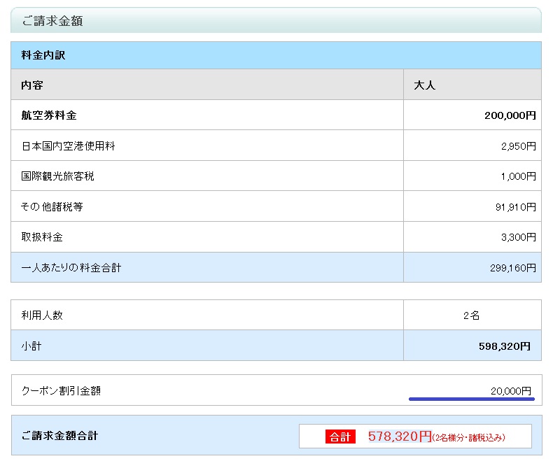 では、最終的な旅費の確認をしてみよう。当初598,320円だったのが、578,320円に値引きされた。これで、20,000円クーポンの使用に成功したことが分かる。
