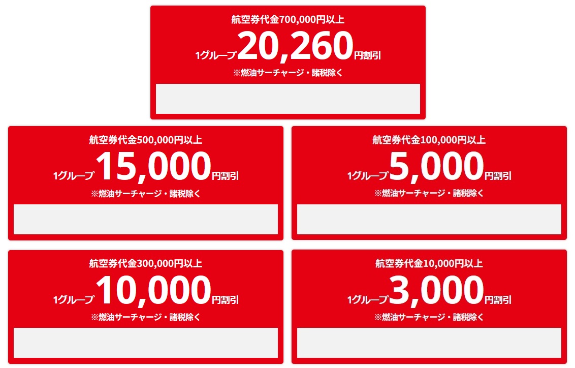 初夢フェア特別版で過去最高の割引額。最大の20,260円OFFは70万円以上の旅費、1万円OFFは30万円以上など、欧米やビジネスクラスが有利となっている。