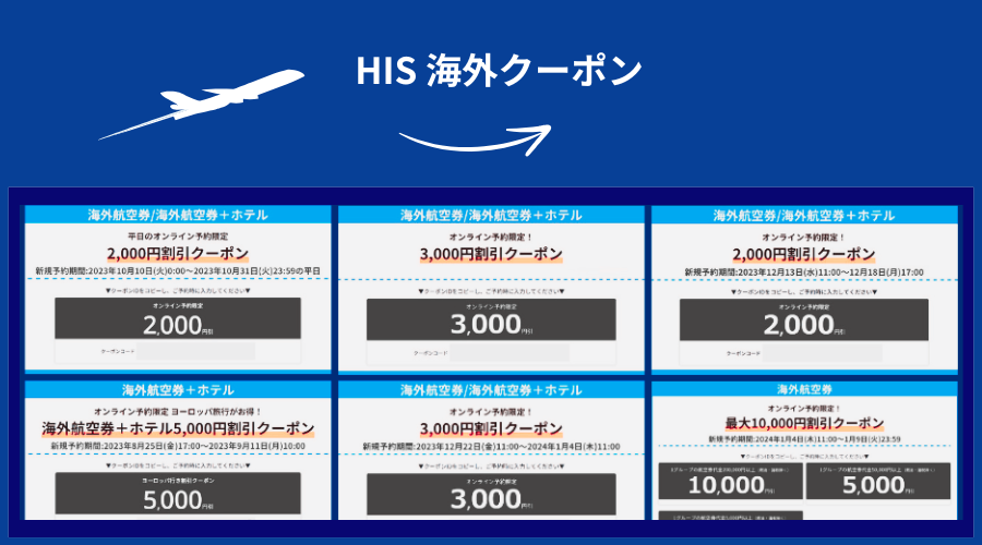 HISのクーポンには「海外航空券」「AirZ(海外航空券+ホテル)」「海外ツアー」の3種類がある。最もお得になるのはツアーで、1万円を超える割引が当たり前にある一方で、航空券は2千円割引がほとんどを占める。その為、欧米やハワイへ行くならツアーを利用するのがおすすめ。