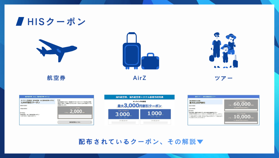 HISのクーポンには「海外航空券」「AirZ(海外航空券+ホテル)」「海外ツアー」の3種類がある。割引額が最も大きいのはツアーで、1万円を超える割引が当たり前にある一方で、航空券は2千円割引がほとんどを占める。その為、欧米やハワイへ行くならツアーを利用するのがおすすめ。