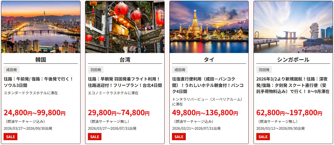 開催期間は2月20日~3月5日。春の旅行向けセールなので、GWの海外はこちらのセールで取るのがおすすめ。アメリカ、ヨーロッパ、アジア各地の特別プランは下から。