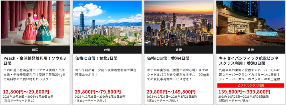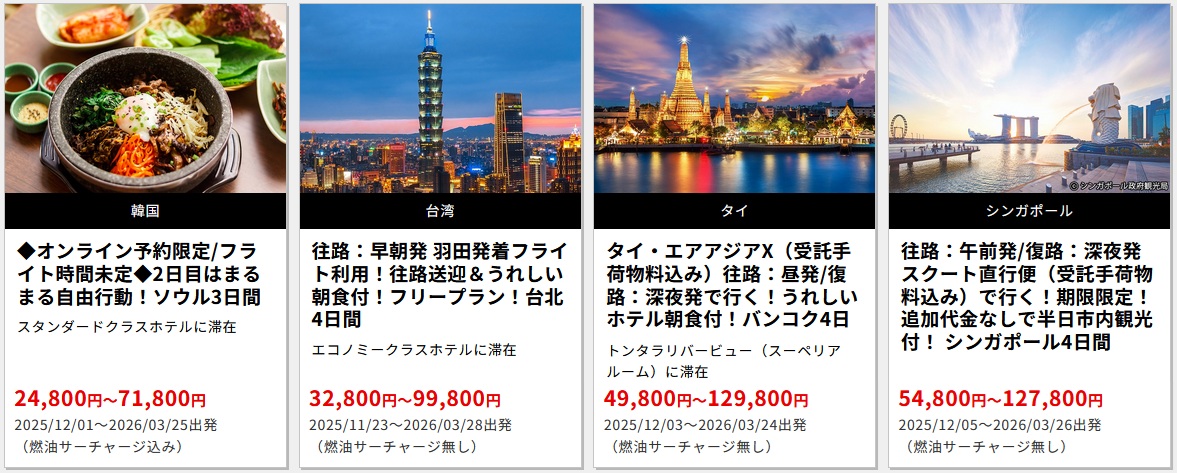 アジア・リゾート系の特価プランが多い(例:バリ島、グアム、沖縄など)