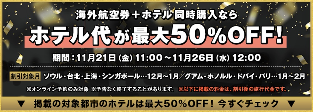 航空券+ホテルでは最大50%OFFのキャンペーンも実施され、アジアは12~1月の旅行、ハワイやヨーロッパは1~2月の旅行で割引が適用される。