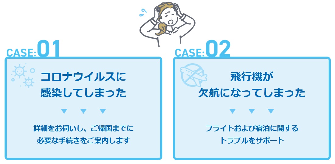 それが24時間サポートコールで、ケース2の「飛行機の欠航」に当てはまる可能性がある。例えば、帰りの便が情勢の悪化で飛ばなくなった場合、日本語で相談が可能だ。あくまでも簡易的なものだが、パニックでどうすればよいか分からなくなった場合の道しるべになってくれる。