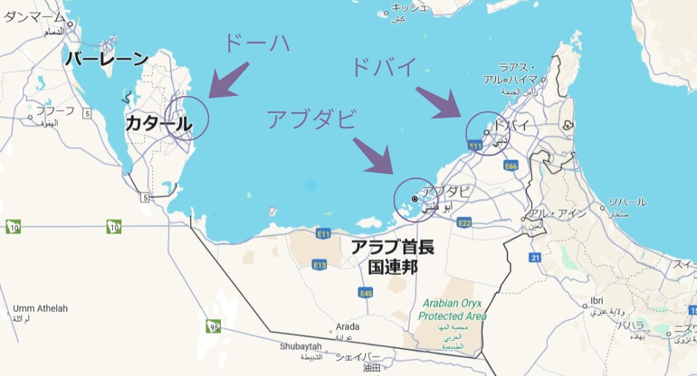 エミレーツ航空、エティハド航空、カタール航空は、それぞれドバイ、アブダビ、ドーハを拠点としている。最も離れているドバイとドーハでも400キロ弱しかなく、これは東京~大阪間とほぼ同じ距離なので地理的にはかなり近い。そして、いずれも乗り継ぎを重視してる点も似ている。