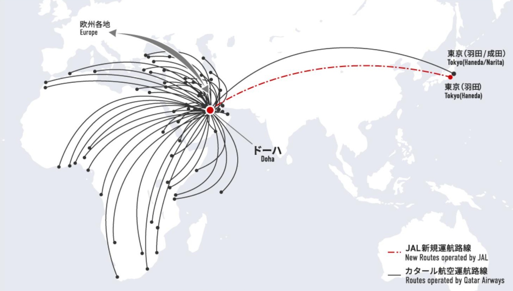JALはロンドン・パリ・フランクフルトなどに自社の直行便を持っており、ドーハを経由するメリットがあまりありません。そのため、わざわざドーハを経由してJAL+カタール航空でヨーロッパへ行く需要は少ないです。