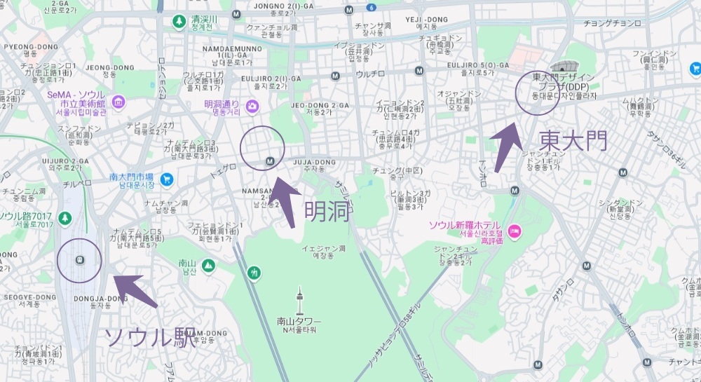 空港鉄道の起点がソウル駅で、その2つ隣が明洞、更に2つ行くと東大門がある。江南は漢江(ハンガン)の南側なので、これらから大きく離れており、初めてで宿泊場所にする人は少ない。立地やホテルの数なども考えると、明洞が最もバランスの良い宿泊場所だといえる。