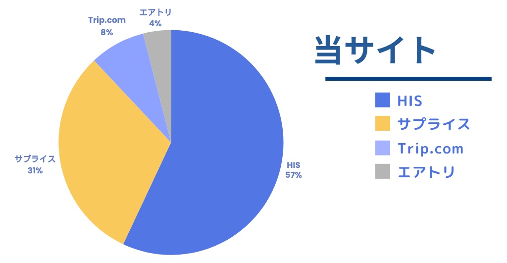 当サイトからの利用状況は、57%がHIS、31%がサプライス、8%がTrip.com、4%がエアトリとなっている。客観的に見ても、手頃な料金に安全性、知名度、簡易サポートがあるHISは選びやすい。