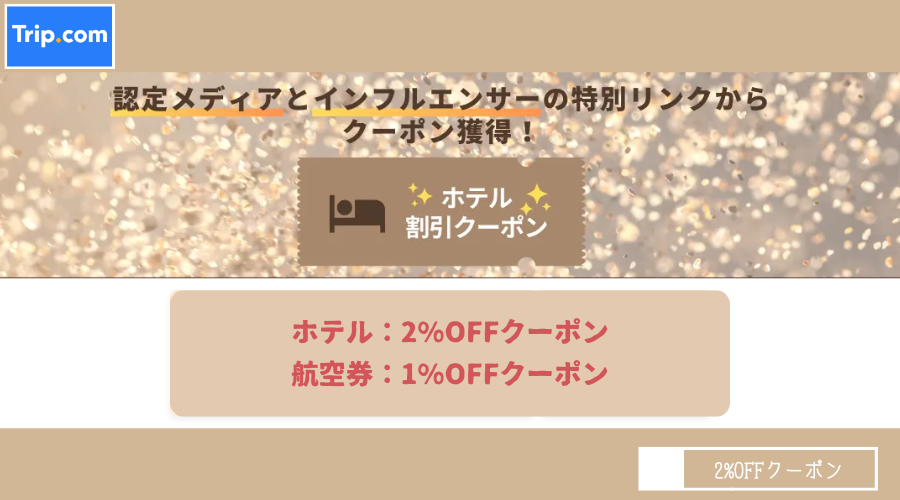 一般公開されていないシークレット『ホテル2%OFF(TRIP1)』『航空券2%OFF(TRIP2)』クーポンを配布中!認定メディア向けに発行されているもので、それぞれのコードをコピーして当サイトから予約すると適用される。条件として、航空券はJAL、ANA、ピーチ、ジェットスターなど日系航空会社は適用外とされている。