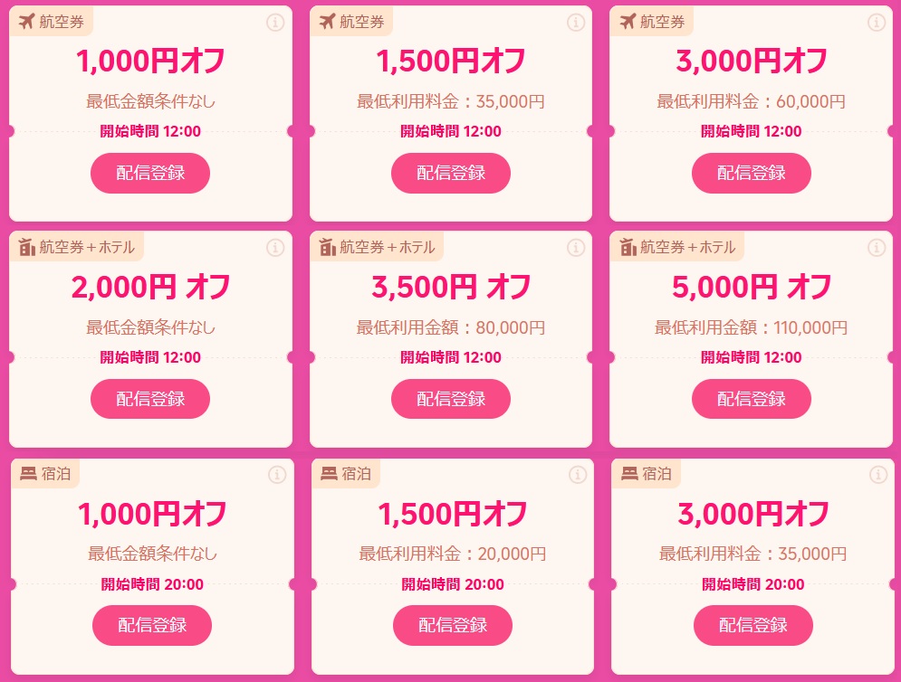 クーポンは、航空券3,000円OFF、ホテル3,000円OFF、航空券+ホテル5,000円OFFという強ラインナップで、それぞれ12時と20時に配布される。上のセール商品よりは争奪にならないが、それでも人気に変わりはないのでお早めに。