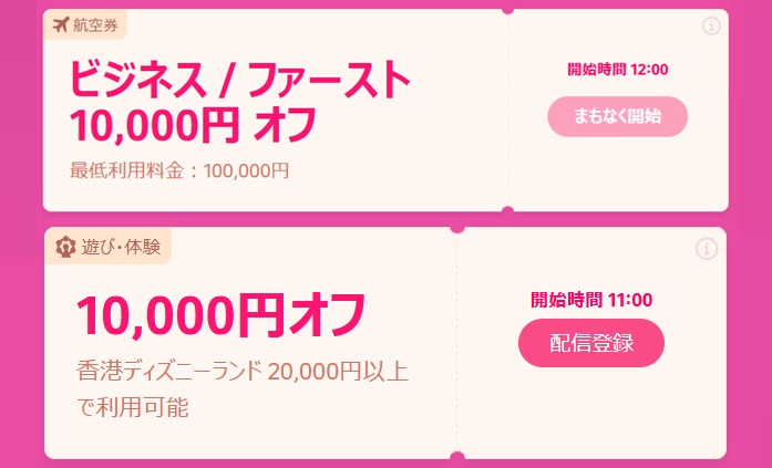 更に、今回は最大10,000円OFFクーポンが用意されており、対象はファーストクラス/ビジネスクラスに使える航空券クーポン、そして香港ディズニーランドで使える遊びクーポンとなっている。