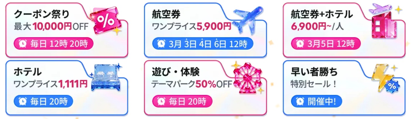 開催期間は3月3日から6日まで。毎日12時、20時に激安価格とクーポンが来るので、気になる人はその時間にチェック。セールの主な対象は、ホテルが国内で、航空券は韓国やバンコクとなっている。