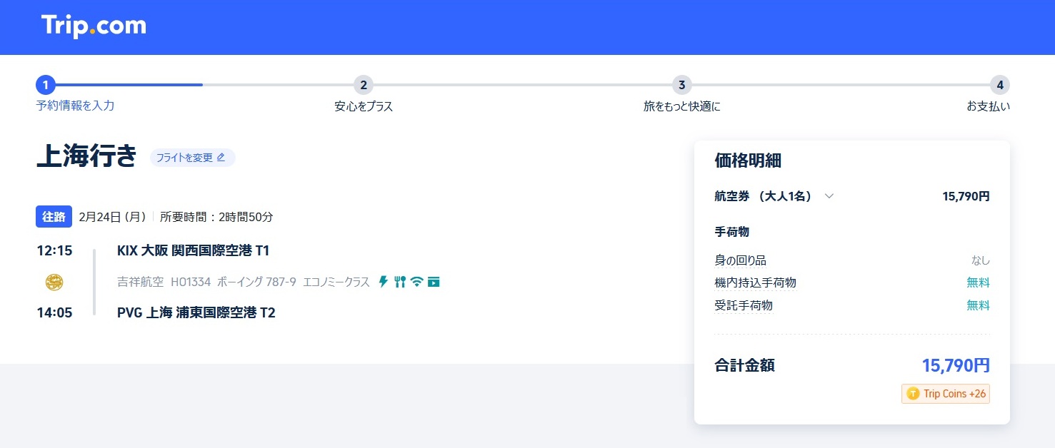 航空券のおすすめの使い方は「1人旅・格安航空券・アジア圏」で、中国を中心に、台湾や韓国、東南アジアへ安く旅行したい人に向いている。実際にSNSなどを見てもこの使い方をしている人が多く、今回は関空→上海の片道15,790円の格安チケットで進めていく。