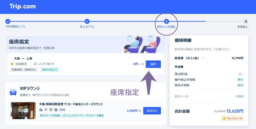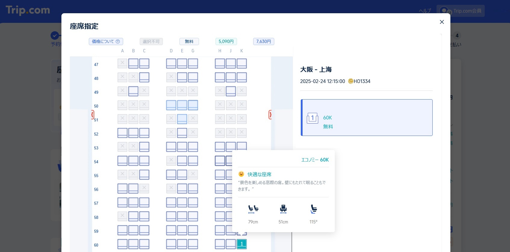 このように無料でありながらも好きな席が選べる。昨今、格安チケットでは座席指定できないことが多いが、今回は昔のようにかなり自由に選ぶことができた。