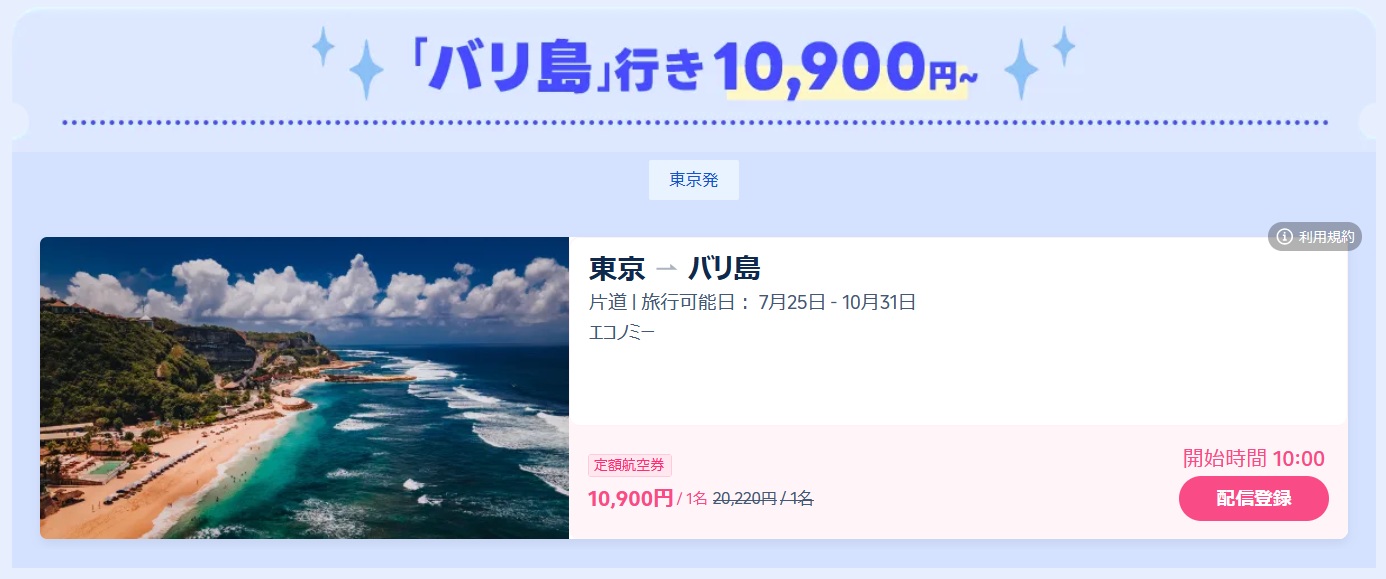 航空券を格安で購入できるのが『海外航空券タイムセール』。その月によって異なるが、今までの最安は片道4,900円で販売された。基本的にソウルや台北、香港など近場がメインで、対象の航空会社もLCCが中心。枚数に限りはあるが、事前の準備をしていれば十分取ることは可能だ。