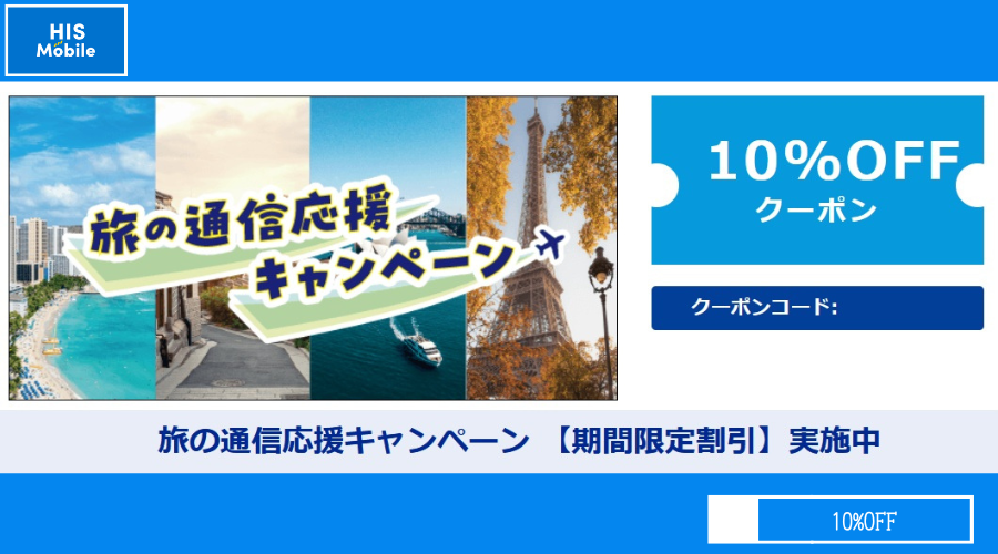 TripSIMのキャンペーンは、クーポンがメインで、割引コードはHISモバイルに加えてHIS(旅行)のページにも登場する。割引率は多くが10%で、他のサービスと同等。同じ会社がWiFiも手掛けているので、料金の比較や、使い方がパソコンメインや家族でシェアするなら、eSIMよりも使いやすい。