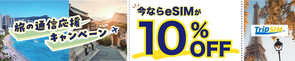 Trip SIMでは、全ての利用者向けに『10%OFFクーポン』を配布!多くのeSIMサービスが初回限定など条件を設けているが、こちらは2回目以降も使え目立った制限はなく、クーポンコードさえ取得すれば割引を受けることができる。
