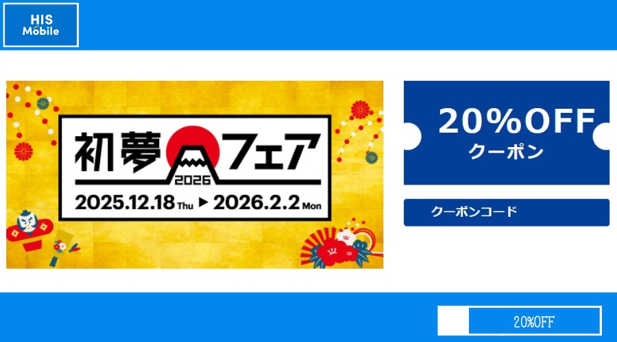 Trip SIMでは、初夢フェアの特別版として『20%OFFクーポン』を配布!通常よりも高い20%という割引率で、12月~2月の期間限定で配布されている。同時に初夢限定プランとして、韓国や台湾、ハワイ、ヨーロッパ周遊などに低価格プランもあるのでチェック。