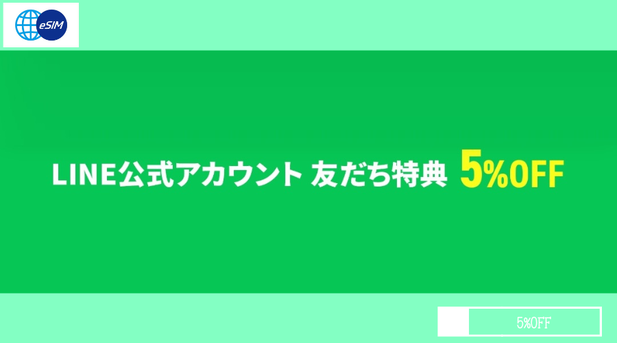 World eSIMでは、LINE友達向けに『5%OFFキャンペーン』を実施!LINEアプリさえあればすぐに適用できる割引方法で、他の割引のように他人のクーポンコードや専用アプリのダウンロードは不要なので、安心して割引を受けることができる。