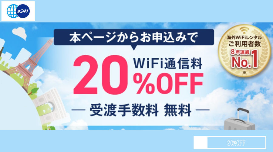 World eSIMのWiFi版であるグローバルWiFiでは、『20%OFFキャンペーン』を実施!こちらは同じ会社(株式会社ビジョン)が行っているサービスで、当サイトからの利用で20%割引が適用される。家族旅行など複数人で使う場合や、PCなど仕事で使う場合は、こちらがおすすめ。